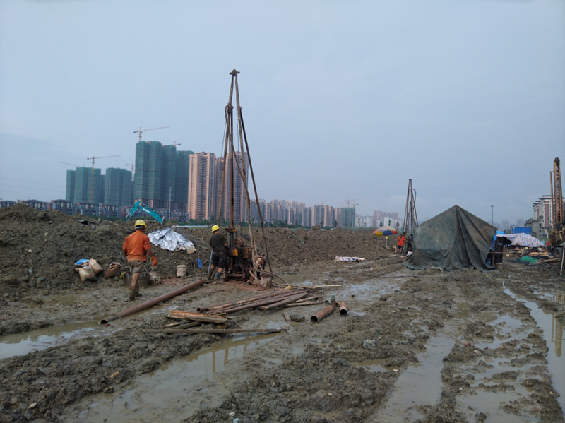 該項目巖土工程勘察原計劃工期為20個日歷天,勘探鉆孔782個、鉆探工作量17118米。開工初期,雖然調(diào)集了30臺鉆機進場,但要滿足建設單位的工期要求,仍存在很大差距,加之連續(xù)下雨導致場地積水嚴重且泥濘不堪,勘探進度十分緩慢,我院水文地質(zhì)工程公司迅速組織安排專人聯(lián)系成都、重慶、成都周邊地區(qū)的數(shù)十支鉆探隊伍,鉆機增至50臺。