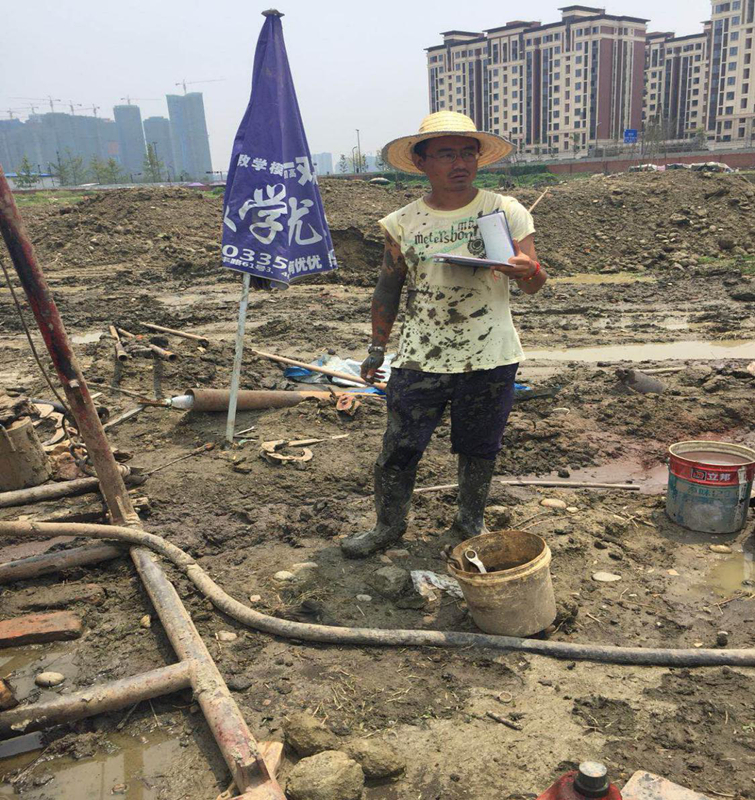 在泥濘場地中安排鉆探生產(chǎn)的項目負責人范偉 勘察項目現(xiàn)場實測溫度約46度