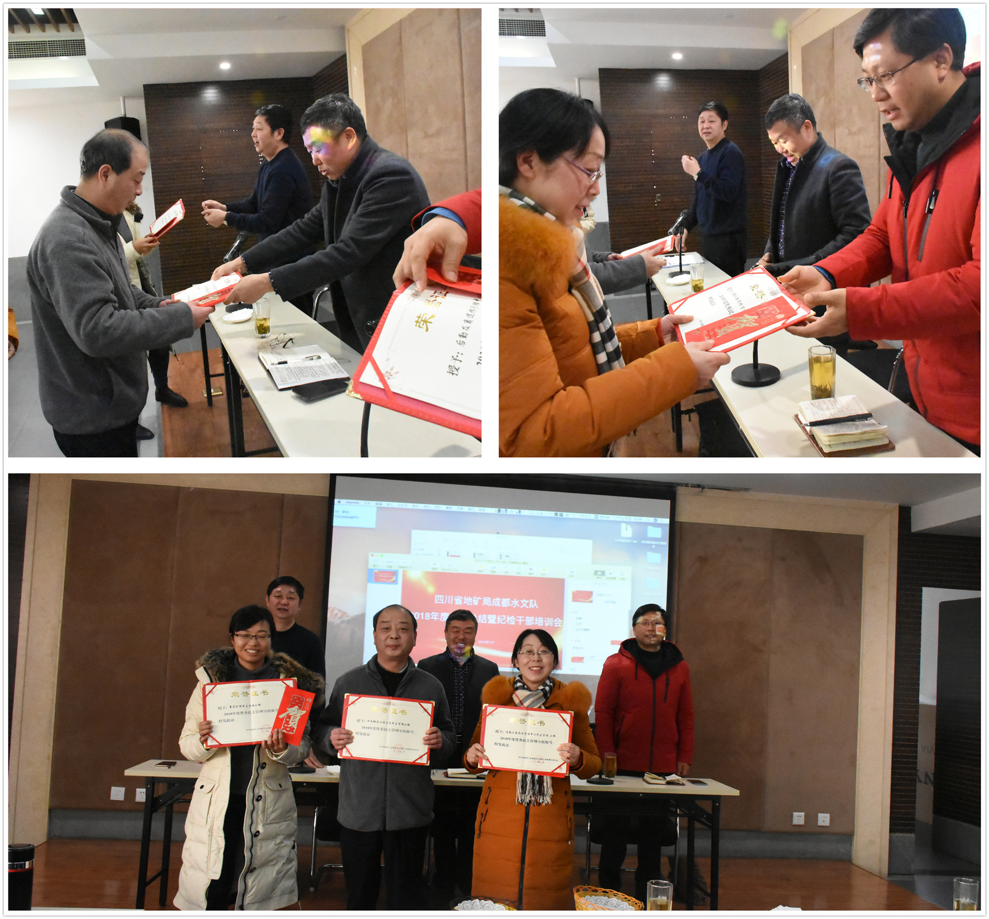 廖華成主席宣讀了2018年度優(yōu)秀民主管理小組的表彰決定, 其中水文地質(zhì)工程公司、重慶分院、后勤及離退休管理中心榮獲優(yōu)秀民主管理小組的榮譽稱號,黨委書記謝大軍、副隊長張宏、工會主席廖華成為獲獎代表頒獎。