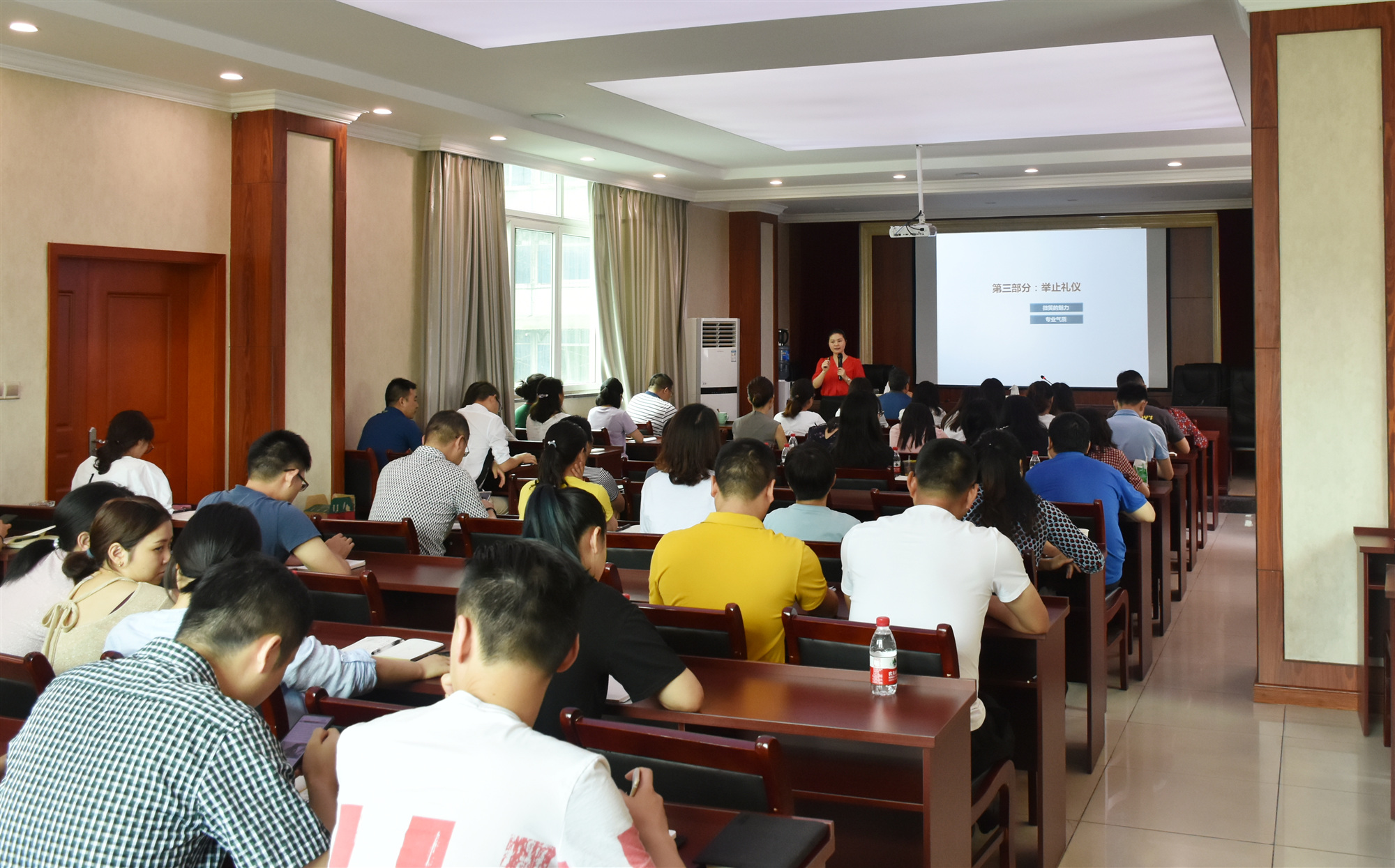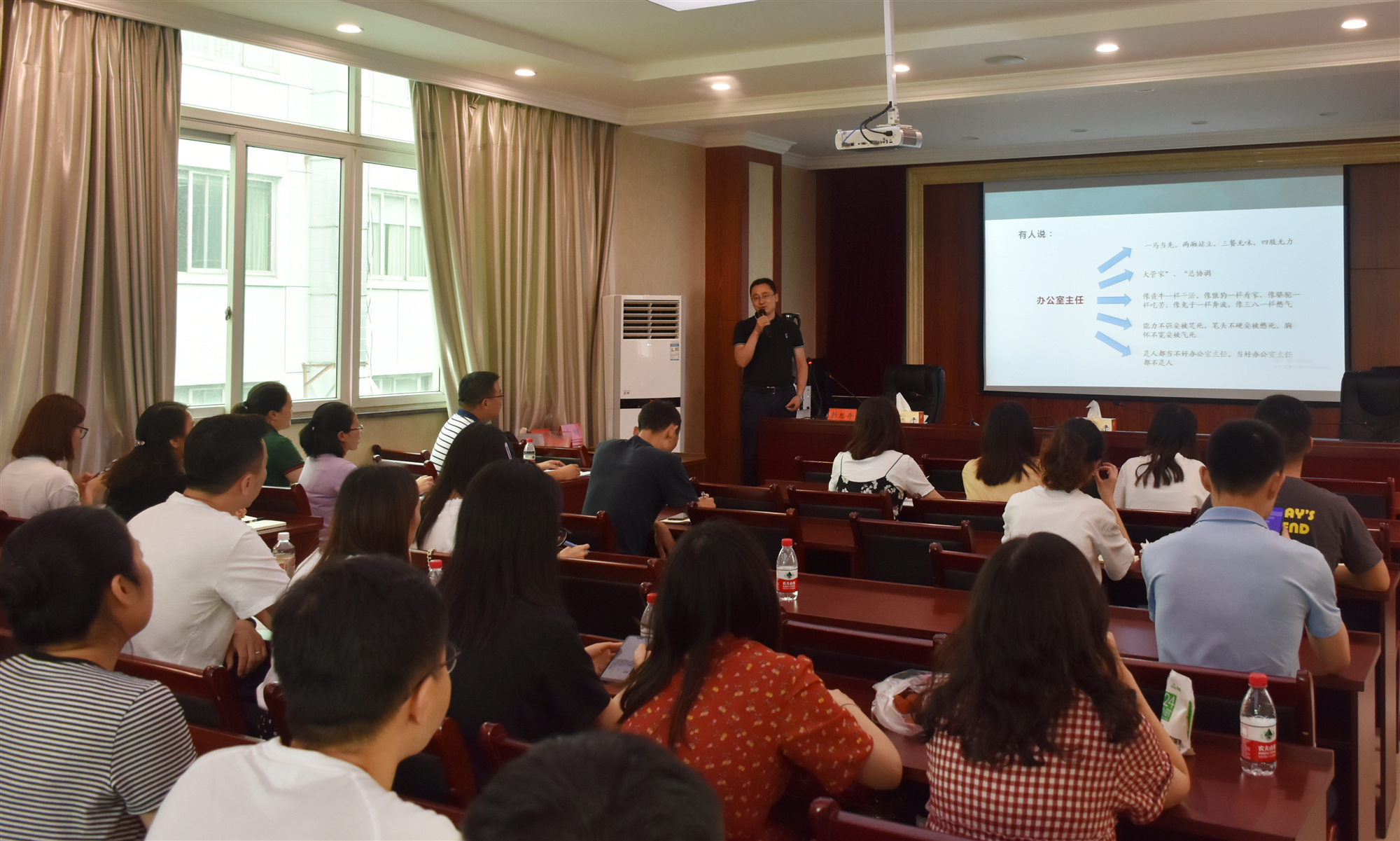 為全面提高院管理水平,切實提升職工業(yè)務素質(zhì)與綜合服務能力,6月20日,院綜合管理部組織開展“2019年度實體辦公室工作人員、經(jīng)營人員培訓會”,特邀職業(yè)禮儀師張?zhí)鸷退拇ㄊ⊥艘圮娙耸聞諒d辦公室主任彭思奇授課。黨委書記謝大軍親臨會場,并作動員講話,來自管理部門及二級實體的70余人參加了培訓。